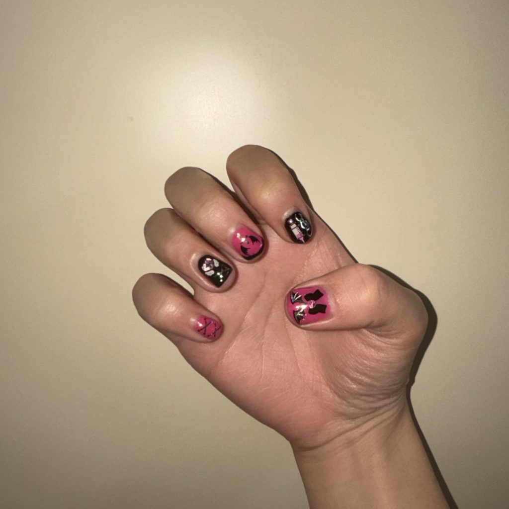 今回はちょっと地雷系ぽいネイルにしてみました( ¨̮ )黒とピンクって最強です