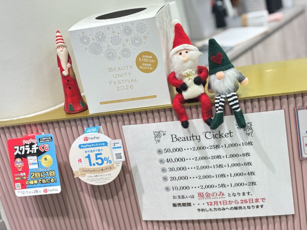 その他、ビューティーチケットの販売(お得なチケットです、気になる方はスタッフにお問い合わせください)や、ギフトカードが当たる!?抽選企画も行っております☆